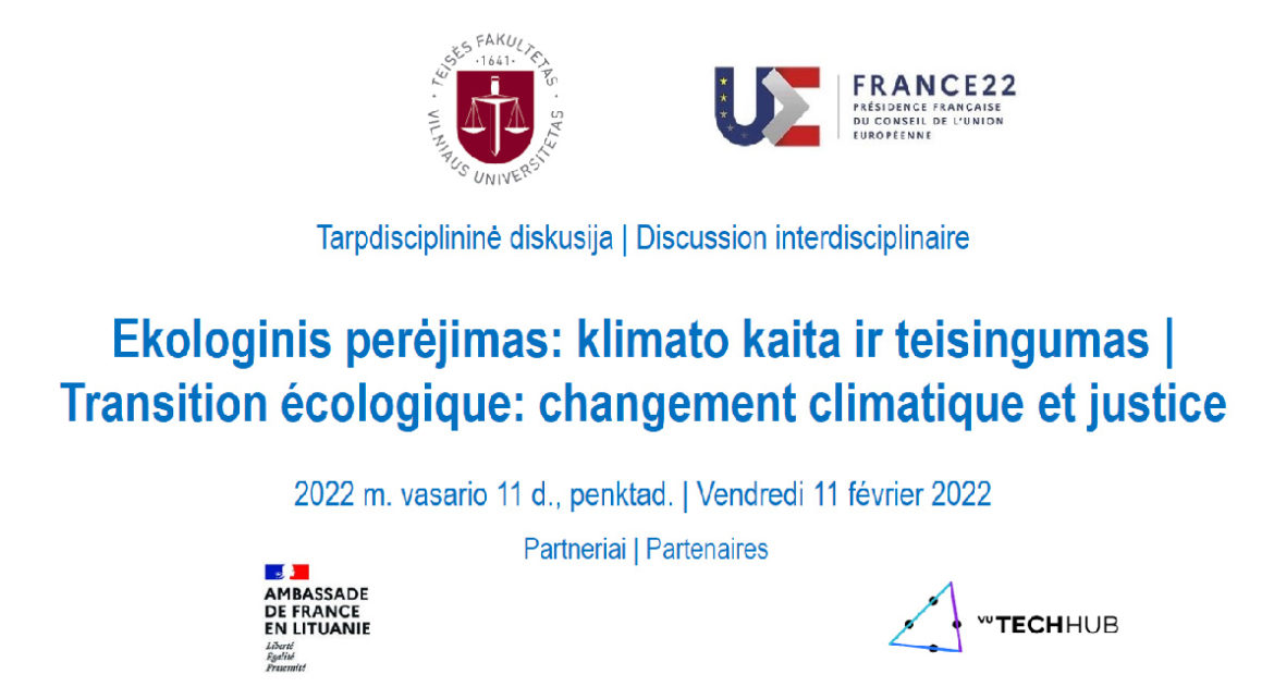Bendradarbiaudamas su Prancūzijos ambasada Lietuvoje, Vilniaus universiteto Teisės fakulteto Prancūzijos teisės centras Prancūzijos pirmininkavimo Europos Sąjungos Tarybai kontekste organizuoja renginių ciklą, skirtą diskutuoti aktualiais klausimais, stiprinti akademinį bei mokslinį universitetinį bendradarbiavimą. Renginių ciklas pradedamas tarpdisciplinine diskusija: „Ekologinis perėjimas: klimato kaita ir teisingumas“. Diskusija vyks 2022 m. vasario 11 d., 10.00 – 12.00 val. (Vilniaus laiku) / 9.00 – 11.00 val. (Paryžiaus laiku) nuotoliniu būdu per ZOOM platformą lietuvių ir prancūzų kalbomis su sinchroniniu vertimu. Kviestiniai diskusijos svečiai – mokslininkai bei ekspertai – atstovauja klimatologijos, klimato kaitos teisės, aplinkos psichologijos ir filosofijos, komunikacijos, Europos Sąjungos politikos sritims.