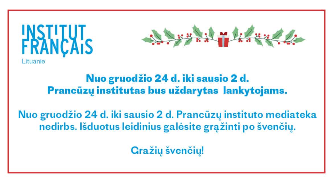Nuo gruodžio 24 d. iki sausio 2 d. Prancūzų institutas bus uždarytas lankytojams.